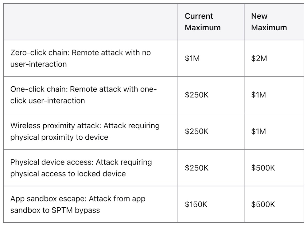 本次調整中,蘋果將最高獎金加倍至 200 萬美元(過往最高獎金為 100 萬美元),專門獎勵能「達成與傭兵間諜軟體(mercenary spyware)相同攻擊效果」的漏洞利用鏈(exploit chains)。該公司強調,這筆獎金是「業界前所未有的金額」,也是目前所有公開漏洞獎金計畫中最高額度的一項。