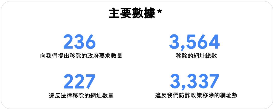 - 成功移除 3,564 個網址,其中包含 227 個違反法律的網址,以及 3,337 個違反 Google 防詐政策的網址。