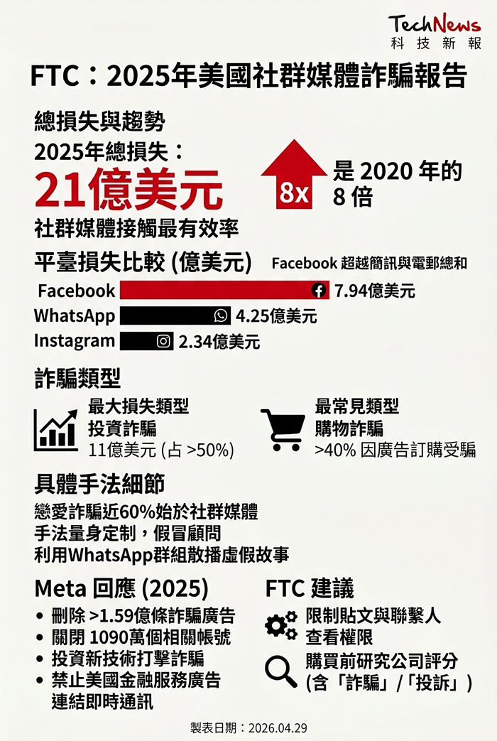 根據聯邦貿易委員會(FTC)的報告,2025 年美國人因社群媒體詐騙損失高達 21 億美元,這個數字是 2020 年的八倍,顯示出社群媒體成為詐騙者最具成本效益的接觸方式。報告指出,近 30% 的詐騙受害者表示,詐騙始於社群媒體,而 Facebook 的詐騙損失更是超過了簡訊和電子郵件的總和。